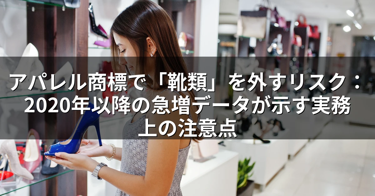 アパレルブランドで商標を出願するとき、洋服だけを指定して靴類を外してしまう登録が、2020年を境に急増しています。J-PlatPatでデータを拾ってみると、2020年の前年比はプラス1,113件(59.0%増)。一時的なブレではなく、その後も高止まりしています。